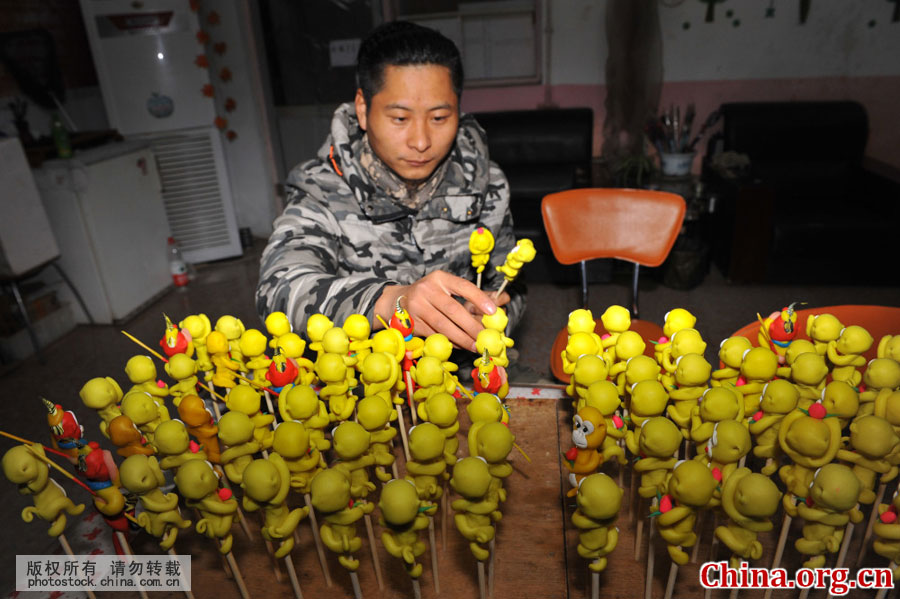 Dough figurine artist Li Jinguo works with great care in Donggang District, Rizhao City in Shandong Province, on Jan. 6, 2016. His latest work – a hundred monkeys welcome the Chinese New Year – took him more than one month to design, two weeks to mold and five kilograms of flour. The dough figurines come in a great variety of shapes and postures. [Photo by Liu Mingzhao/China.com.cn] |