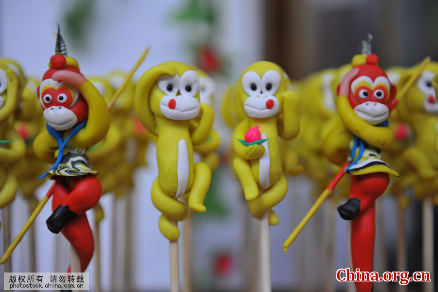 Dough figurine artist Li Jinguo works with great care in Donggang District, Rizhao City in Shandong Province, on Jan. 6, 2016. His latest work – a hundred monkeys welcome the Chinese New Year – took him more than one month to design, two weeks to mold and five kilograms of flour. The dough figurines come in a great variety of shapes and postures. [Photo by Liu Mingzhao/China.com.cn]