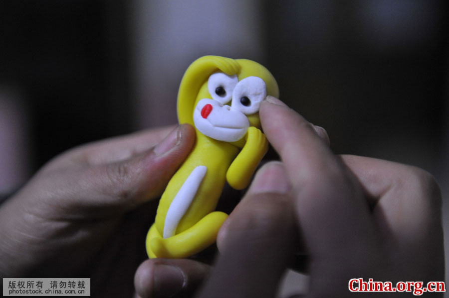 Dough figurine artist Li Jinguo shows one of his latest works – a hundred monkeys welcome the Chinese New Year – in Donggang District, Rizhao City in Shandong Province, on Jan. 6, 2016. The work took him more than one month to design, two weeks to mold and five kilograms of flour. [Photo by Liu Mingzhao/China.com.cn] |